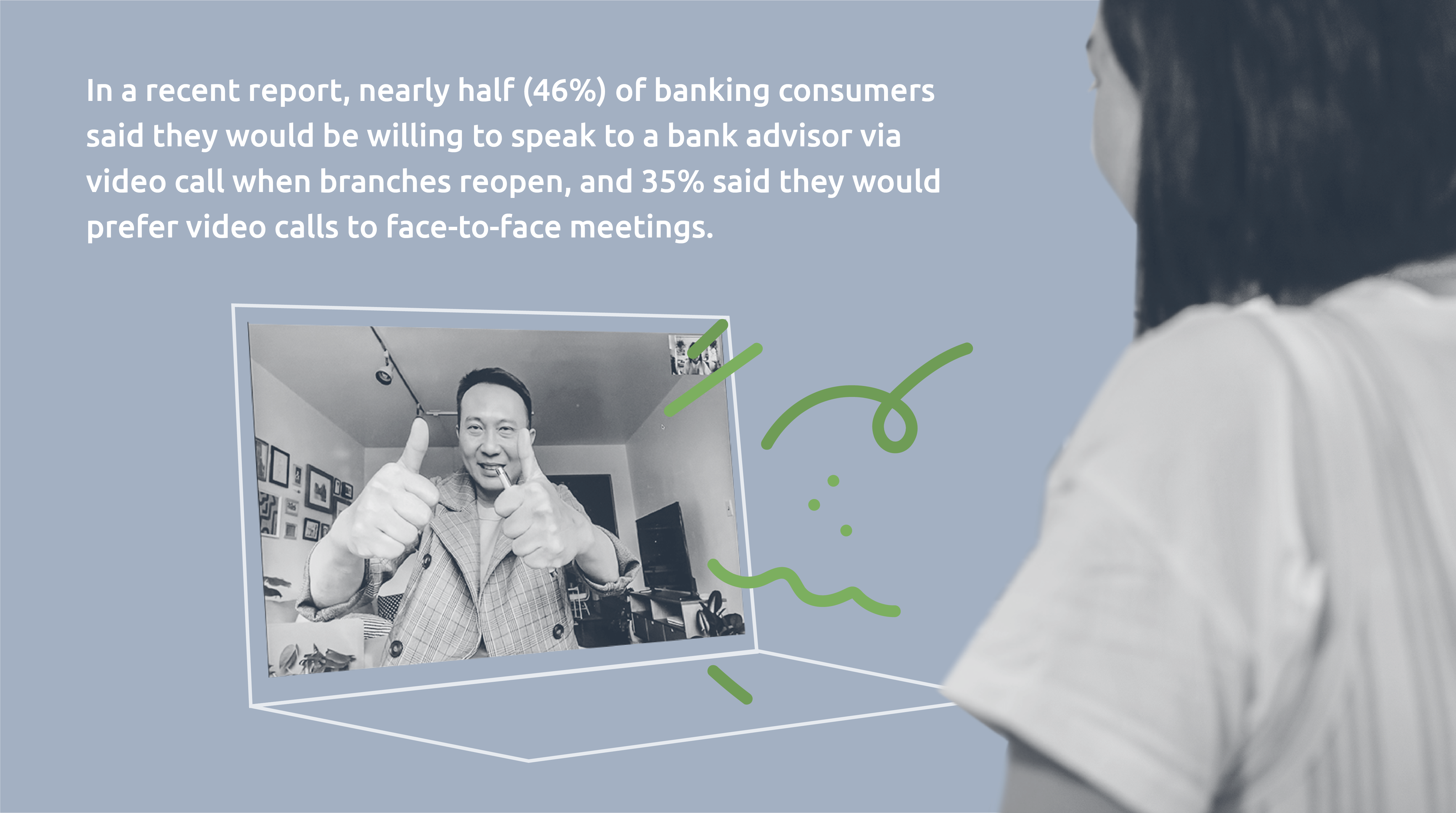 According to one recent report, “Prior to COVID-19, only 15% of consumers had spoken to a bank advisor via video call, but nearly half (46%) said they would be willing to do so when branches reopen, and 35% said they would prefer video calls to face-to-face meetings.”